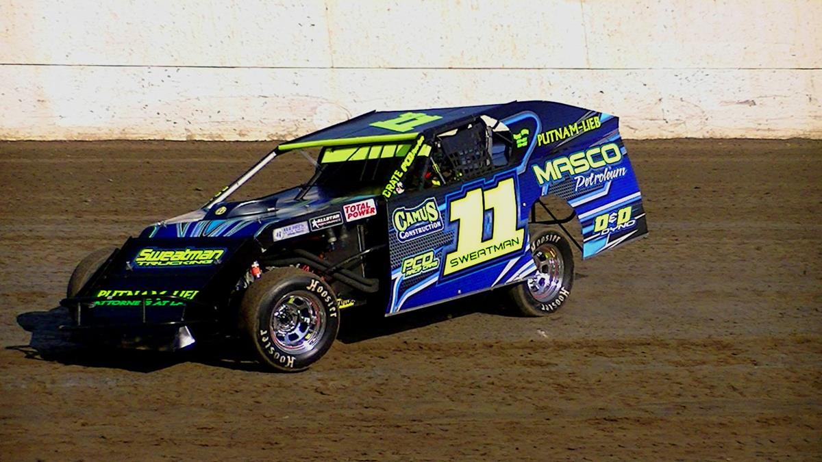 Sweatman would lead Asche, and Miller down on the restart, and pull away slightly, as the battle to watch was for third, fourth, and fifth between Bremerton's James Wolfard, Carl Larson of Kelso and Schnitzer, as they would race side by side, and almost three wide for a handful of laps. Sweatman would continue to lead the feature, and pull away from the field, while Asche, and Scott Miller would race side by side for multiple laps putting on a show for the fans. Sweatman would go on to win the Modified feature, Asche, Scott Miller, Larson, and Schnitzer would round out the top five. Heat race winners were Austin Kerrigan, and Scott Miller.